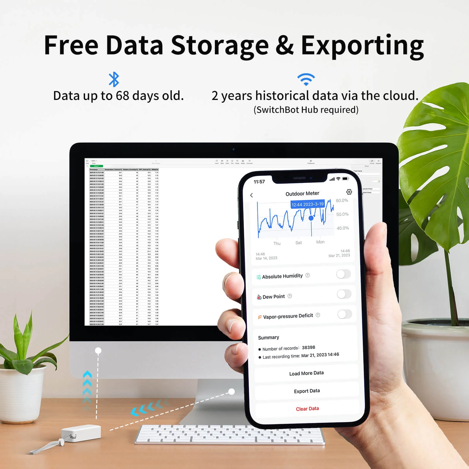 - Supports Data Exporting: 394ft connecting distance (no obstacles) allows you to quickly and clearly view the temperature and humidity yearly, monthly, daily, or by the hour. Enjoy up to 68 days On-board Data Storage and up to 2 years In-App Data Storage(Unlimited cloud storage if SwitchBot Hub is added). Data can be exported as. csv file for more in-depth analysis of your environmental. Supports multiple methods of data calibration.